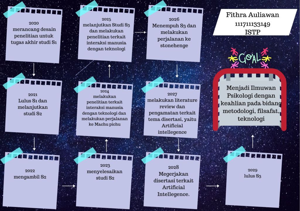 Untuk dapat meraih impian menjadi seorang ilmuwan psikologi yang ahli dalam bidang research method, teknologi, serta peradaban, saya membuat sebuah rancangan berupa road map untuk 10 tahun kedepan. Secara spesifik road map ini berisi capaian-capaian yang ingin diraih dan sesuatu yang perlu dilakukan untuk setiap tahunnya dengan harapan membantu dalam mencapai impian saya. Berikut adalah penjelasan terkait road map untuk 10 tahun kedepan: